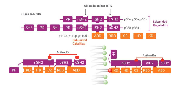 PI3K clase IA consiste de una de tres isoformas catalíticas (p110 a, b, y d) codificadas por los genes PIK3CA, PIK3CB, y PIK3CD, y una subunidad reguladora, que puede ser p85α o sus variantes por splicing (p55α y p50α), p85β o p55g (Figura 2).