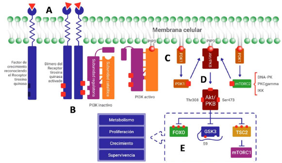 En condiciones fisiológicas, PI3K se activa mediante señales extracelulares como factores de crecimiento (factor de crecimiento epidérmico, factor de crecimiento derivado de plaquetas, factor de crecimiento similar a la insulina), citoquinas, hormonas, entre otros, que interactúan con un receptor tirosina quinasa (RTK), lo cual induce a su dimerización y producción de cambios conformacionales a partir de la fosforilación de los residuos de tirosina en las regiones citoplasmáticas del RTK (Figura 3A). Estos cambios en el dominio citoplasmático del RTK permiten el