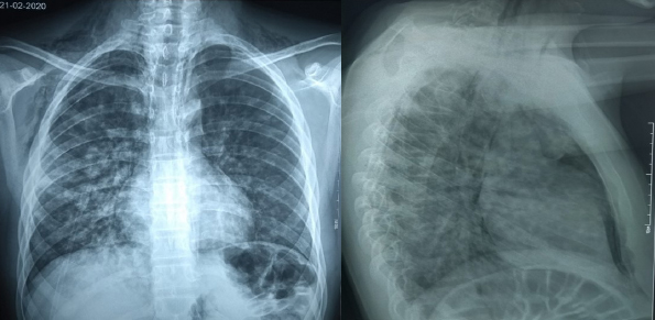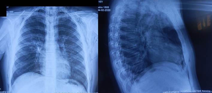 Varón de 16 años, natural y procedente del distrito de San Marcos (2964 m s. n. m.), en Huari (3150 m s. n. m.), quien estuvo doce días de vacaciones a nivel del mar. Luego de tres días, regresó a su pueblo a las 5 a. m., y a las 11 a. m. se traslada con su familia a una región de mayor altitud, y entonces se siente cansado. Por la tarde retorna a su domicilio, y en la noche presenta tos seca y fatiga. Al día siguiente, aumenta la tos, refiere dolor torácico, disnea y cansancio para caminar. Asimismo, se agrega tos más frecuente con expectoración rosada y dolor de garganta. Acude al Centro de Salud (CS) de San Marcos con diagnóstico de bronquitis aguda. Como se incrementan los síntomas, retorna al CS al día siguiente, de donde lo refieren al Hospital Víctor Ramos Guardia de Huaraz (3050 m s. n. m.), donde ingresa por emergencia el 3 de febrero del 2020 a las 21:58 h. Niega tener antecedentes de enfermedades cardiopulmonares y soroche agudo. No consume drogas ilícitas ni ha tenido traumatismos previos.