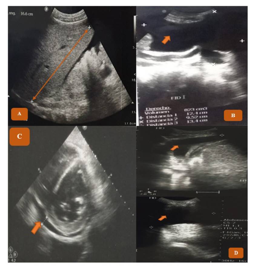 Figura 1 Ecografía abdominal completa muestra (A) Hepatomegalia (↔) : hígado con una longitud de 166 mm, y ascitis (→): líquido libre en cavidad abdominopélvica en la (B) fosa iliaca derecha (823 cm3). La ecocardiografía transtorácica muestra (C) derrame pericárdico (→); (D) La ecografía de tórax muestra derrame pleural bilateral (→): líquido libre en hemitórax derecho (140 cm3) y en hemitórax izquierdo (320 cm3)