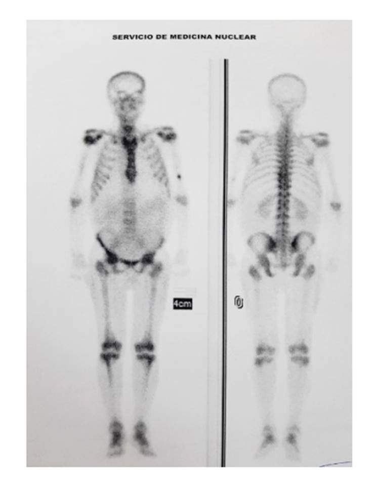 Figura 3 La gammagrafía ósea muestra hipercaptación del radiofármaco en las articulaciones de rodilla, tibioperonea astragalina y coxofemoral relacionada a procesos inflamatorios