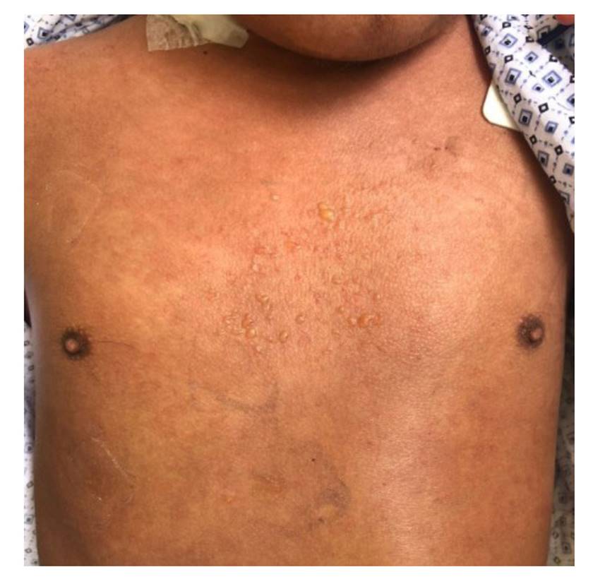 Paciente varón de 16 años, natural de una de las regiones del interior del país (residente actual de un distrito de la capital), con tiempo de enfermedad de tres meses de lupus eritematoso sistémico (LES) y que recibe tratamiento con corticoides. Acude a nuestro nosocomio por Emergencia por presentar, durante dos semanas, dolor hemitorácico, oliguria y disnea. Al séptimo día de hospitalización, tras encontrarse en su segundo pulso con metilprednisolona y en hemodiálisis por un catéter de alto flujo (CAF), cursa febril y presenta la aparición de ampollas tensas en la cara, el tórax y el abdomen, así como ampollas hemorrágicas que aparecen mayormente en las extremidades (Figuras 1 y Figura 2).