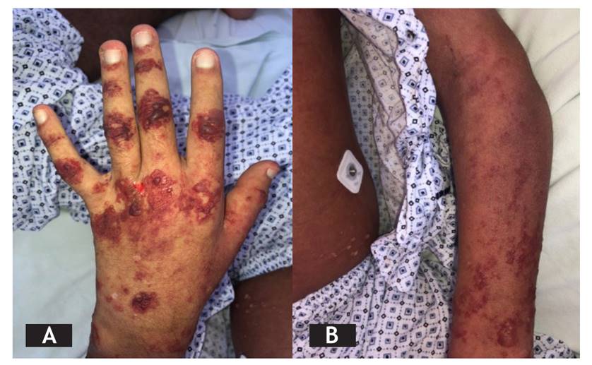 Figura 2 (A) Ampollas hemorrágicas tensas en dorso de manos con predominio en nudillos y (B) brazos.