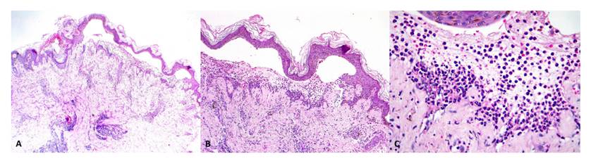 Ecocardiograma: fracción de eyección del ventrículo izquierdo (FEVI) 58 %, contractilidad conservada, no se observan vegetaciones. Se inició la cobertura antibiótica con vancomicina y se realizó un recambio del catéter de diálisis. Además, se practicó al paciente una biopsia de piel con resultado histopatológico de dermatosis ampollar subepidérmica (Figura 3 A, B) con numerosos neutrófilos (Figura 3 C), que se visualizan a mayor aumento (X40).