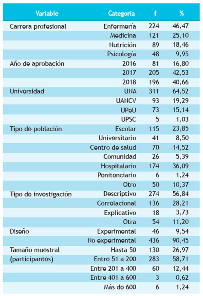 En cuanto a las características metodológicas, el 36,09 % incluyó población hospitalaria y el 23,85 %, escolares. Además, el 56,84 % son estudios descriptivos y 28,21 % son de tipo correlacional, lo cual concuerda con el diseño predominante que, en este caso, es no experimental (90,45 %). Por último, el tamaño de muestra más frecuente se ubica entre 51 a 200 participantes (58,71 %).