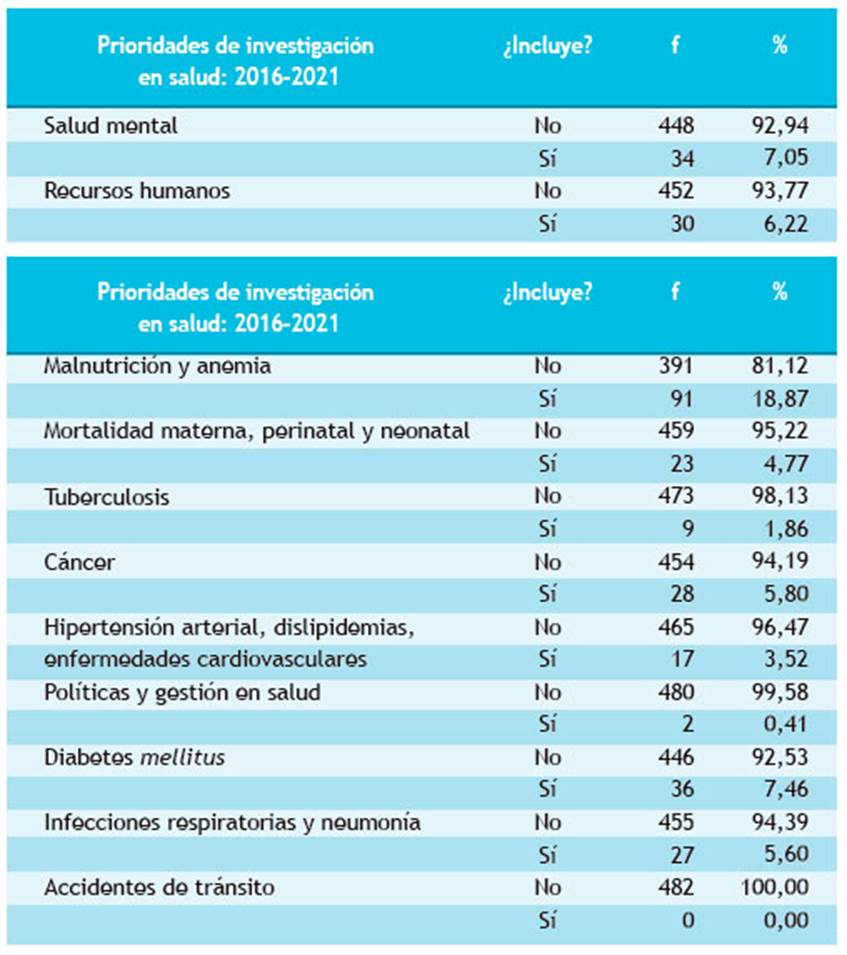 La Tabla 2 muestra que 297 tesis (61,62 %) abordaron alguna prioridad de estudio de salud y que la más frecuente fue malnutrición y anemia (18,87 %), seguida por diabetes mellitus (7,46 %), salud mental (7,05 %), recursos humanos (6,22 %), mortalidad materna, perinatal y neonatal (4,77 %), cáncer (5,80 %), infecciones respiratorias y neumonía (5,60 %), hipertensión arterial, dislipidemias y enfermedades cardiovasculares (3,52 %), tuberculosis (1,86 %) y políticas y gestión en salud (0,41 %), y ninguna tesis incluye accidentes de tránsito.