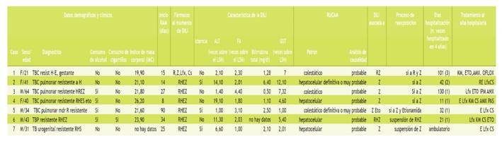 El presente estudio reporta las características de 7 casos (de un total de 188, frecuencia 3,70 %) de DILI asociada a antituberculosos en pacientes con TB-MDR, cuyo evento se presentó a los 30,4 + 27,7 días del inicio del tratamiento. De ellos, 3 (43,00 %) presentaron ictericia; 4 (57,00 %) tuvieron patrón hepatocelular, y 3 (43,00 %), patrón colestásico; se registraron 4 (57,00 %) casos leves y 3 (43,00 %), moderados. La media de la fosfatasa alcalina (FA) (desviación estándar), la alanina aminotransferasa (ALT) y la gamma glutamiltranspeptidasa (GGT) séricas fueron de 2,40 (1,10), 7,90 (7,10) y 5,6 (3,70) veces el límite superior normal (LSN). La media de bilirrubina total fue de 2,30 (2,10) (rango 0,50-6,40 mg/dl). Cuatro casos estuvieron asociados a la pirazinamida (86,00 %); 1, a la pirazinamida y la etionamida; 1, a la rifampicina, la isoniacida y la pirazinamida Z; 1, a la rifampicina y pirazinamida Z. La media de hospitalización fue de 48,14 días; adicionalmente, se necesitó realizar de 1 a 3 internamientos durante el periodo de investigación.