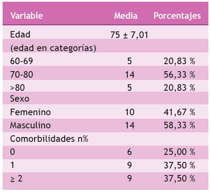 En cuanto a sexo, del total, 10 fueron mujeres, que equivale al 41,67 %, y 14 fueron hombres, lo que corresponde al 58,33 %. La multimorbilidad se dividió en tres categorías: 0 o ninguna, 1 y ≥ 2 comorbilidades. Se obtuvo en el primer grupo 6 participantes, que equivale al 25 %; el segundo grupo, 9 participantes, con 1 comorbilidad, que equivale al 37,50 %; el tercer grupo, 9 participantes, con ≥ 2 comorbilidades, que equivale al 37,50 %.