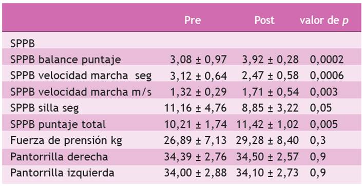 En la prueba del SPPB balance, el puntaje previo a la intervención fue 3,08 ± 0,97, y el posterior a la intervención, 3,92 ± 0,28, con un valor de p < 0,0002 (Tabla 2). La velocidad de marcha se obtuvo en segundos, para la preintervención 3,12 ± 0,64, y para la posintervención, 2,47 ± 0,58, con valor de p < 0,0006. Cuando se midió la velocidad de marcha por m/s se encontró 1,32 ± 0,29 en la preintervención y, en la posintervención, 1,71 ± 0,54, con un valor de p < 0,003. En cuanto al SPPB utilizando la silla, en segundos, se encontró 11,16 ± 4,76 antes de la intervención y 8,85 ± 3,22 después de esta, con un valor de p < 0,05. La fuerza de presión, método utilizado para medir la fuerza en las personas, se midió por kilogramos, lo cual dio como resultado previo a la intervención 26,89 ± 7,13 y, posterior a esta, 29,28 ± 8,40, con un valor de p < 0,3.