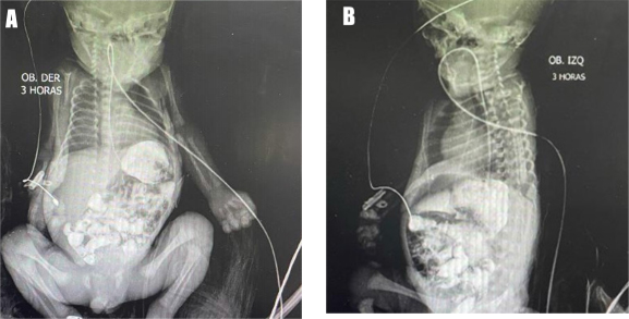 El paciente cursó desde las 12 horas de vida con vómitos lácteos (10-15cc) tras el inicio de la nutrición enteral (20cc/kg/día), que estuvo acompañada por distensión abdominal intermitente y residuos gástricos biliosos de cuantía 2-11cc. El paciente realizaba deposiciones de manera espontánea con una frecuencia de 1 vez cada 5 días. Se indicó reposo gástrico y al reinicio de vía oral presentó la sintomatología digestiva ya descrita, motivo por el cual fue sometido a estudios de laboratorio y de imágenes (Tabla 1). En la evaluación física general se evidenció abdomen globuloso con episodios de distensión abdominal intermitente, con ruidos hidroaéreos presentes pero disminuidos y poco depresible a la palpación; el resto del examen físico no mostró alteraciones. El paciente fue evaluado por Cirugía Pediátrica, sin evidencia de irritación peritoneal; no tributario de tratamiento quirúrgico, por lo que se solicitó complementar con un estudio de imagenología. Se realizaron radiografías simples de abdomen en decúbito y de pie, y se evidenció signo de doble burbuja (Figura 1).
