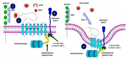 Existen varios mecanismos de retroalimentación negativa para evitar una señalización excesiva de Wnt, así, por ejemplo, el gen AXIN2 (también conocido como conductin) ayuda a aumentar la actividad del complejo de destrucción citosólica y produce una disminución de transcripción mediada por β-catenina 42; la inducción de la expresión de las ligasas E3 unidas a la membrana ring finger protein 43 (RNF43) y zinc and ring finger protein 3 (ZNRF3) median la ubiquitinación de los receptores Wnt, lo que impulsa su internalización y degradación lisosomal 43,44. Sin embargo, dentro de la célula madre adulta, esta retroalimentación negativa es contrarrestada localmente por la familia de proteínas R Spondin, que forma un complejo con el receptor acoplado a la proteína G que contiene repeticiones ricas en leucina (LGR) y RNF43 o ZNRF3, lo que promueve su degradación lisosomal 45 (Figura 4).