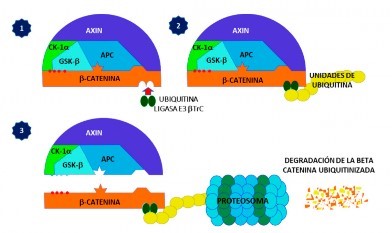 La proteína β-catenina citoplasmática se degrada constantemente por la acción del complejo proteico destructor, el cual se encuentra compuesto por a) proteínas de andamiaje (Axin [inhibidor de Axis]; la proteína APC, producto del gen supresor de tumores Adenomatous polyposis coli); b) las proteínas quinasas (caseína quinasa 1 a [CK1β]; la glucógeno sintasa quinasa 3b [GSK3β]). CK1α inicia un conjunto de fosforilaciones en secuencia de la β-catenina, con la fosforilación del aminoácido serina en posición 45 y, posteriormente, GSK3β lo hace en los residuos serina en las posiciones 33 y 37, y en la treonina 41. La fosforilación secuencial de la región amino terminal de la β-catenina atrae a la proteína ubiquitina ligasa E3 βTrC, la cual inicia un proceso de ubiquitinación de la β-catenina y su posterior degradación en el proteosoma (Figura 3).