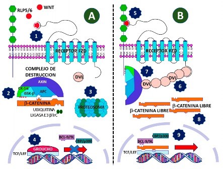 Figura 4 Actividad de la vía Wnt/β-catenina. A. Vía inactiva: 1) el ligando WNT no llega a formar el trímero de activación de la vía, por tanto, la proteína DVL no se asocia a la parte intracitoplasmática del receptor FZD y permanece inactiva. 2) El complejo de destrucción no migra hacia la membrana celular y atrae a la β-catenina, que es fosforilada por CK-1a y GSK3-b, activando la ligasa E3 bTrC. 3) La β-catenina es llevada al proteosoma, donde se destruye. 4) En el núcleo el factor de transcripción TCF/LEF está inactivo por el bloqueo de su actividad por la proteína Groucho, como consecuencia, no se produce activación de los genes derivados de la activación de esta vía. B. Vía activa: 1) el ligando WNT se une al receptor FZD y provoca un cambio de conformación. 5) El cambio conformacional permite su acople al correceptor RLP5/6 y la activación de la parte intracitoplasmática del receptor FZD, lo cual promueve su acoplamiento con DVL. 6) DVL sufre polimerización y secuestro del complejo de destrucción hacia la membrana celular. 7) CK-1a y GSK3-b fosforilan la cola intracitoplasmática de RLP5/6, y permanece allí. 8) Aumenta la β-catenina libre en el citoplasma, desplazándose al núcleo celular. 9) Groucho es desplazado por la β-catenina, lo que permite el acople de β-catenina al factor de transcripción TCF/LEF y el adose de BCL9/9L y CBP/p300, reguladores transcripcionales, con lo cual se inicia las transcripciones genéticas respectivas. Axin (Inhibidor de Axis); APC: supresor de tumores Adenomatous Polyposis Coli; CK1a: proteína quinasa caseína quinasa 1-a; GSK3b: glucógeno sintasa quinasa 3-b. RLP5/6: proteínas relacionadas al receptor 5 o 6 del LDL. DVL: proteina Dishevelled; TCF/LEF: factor celular T/factor de realce linfoide; BCL9/9L: B-cell CLL/lymphoma 9 protein; CBP/p300: CREB-binding protein.