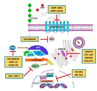 Los inhibidores de PORCN (enzima porcupine) se utilizan para interrumpir la señalización de Wnt al bloquear la secreción de proteínasWnt mediantela inhibiciónde unaenzimabiosintética clave. Existen hasta cuatro moléculas en actual investigación (LGK974, ETC-159, RXC004 y CGX1321), las cuales están siendo exploradas en estudios clínicos incipientes. A pesar de los prometedores resultados preclínicos, los efectos adversos de los inhibidores de PORCN, que incluyen pérdida ósea y disgeusia, posiblemente limiten la dosis a la que se pueden aplicar en la clínica 63. GSK-3β es una parte importante del "complejo de destrucción" en la vía Wnt/β-catenina. Pequeñas moléculas de GSK-3β están siendo usadas en melanoma maligno con un relativo éxito, sin embargo, no han funcionado igual en CCR 64.
