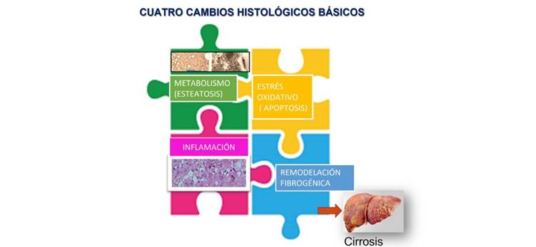 Existen 4 cambios histológicos básicos que condicionan el desarrollo de la enfermedad por esteatosis hepática no alcohólica e incluyen esteatosis, estrés oxidativo, inflamación y el desarrollo de fibrosis (Figura 1).