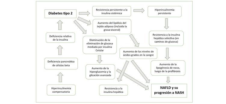 Este trastorno se vincula íntimamente con la resistencia a la insulina, debido a ello se considera que es una manifestación hepática a causa del síndrome metabólico. La EHGNA es una manifestación del síndrome metabólico. Esta complicación afecta con más frecuencia a pacientes con DM2. En comparación con pacientes no diabéticos con enfermedades por EHGNA, la prevalencia de esteatosis hepática es aproximadamente un 80 % superior en sujetos con DM2 según sexo y edad 1. De igual modo, en pacientes con diabetes mellitus la frecuencia de cirrosis es cerca de 30 %. Asimismo, la diabetes tipo 2 agrava la EHGNA, ya que la diabetes mal controlada puede promover o exacerbar la esteatosis hepática. Por otro lado, la EHGNA lleva a hiperglicemia, lo que contribuye a un círculo vicioso 2.