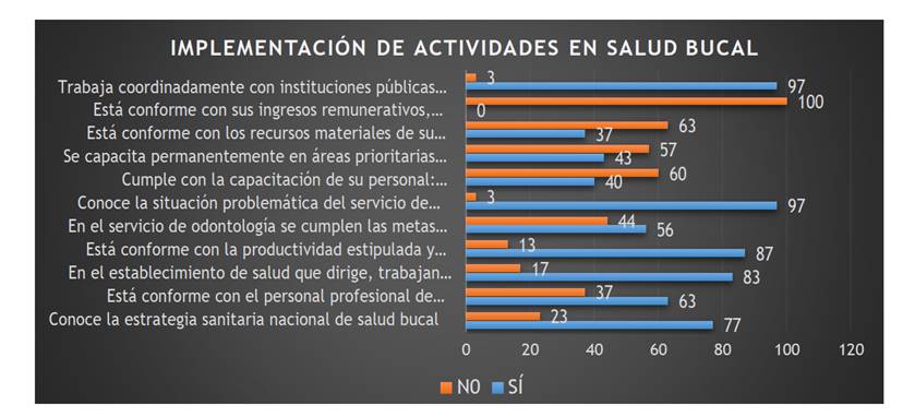 En la Figura 1 y Tabla 1 observamos a los gestores (43,85 %) y a los operadores locales (57 %), donde el 51 % son mujeres; mientras que la Figura 2 muestra el desconocimiento de las disposiciones normativas actuales (23 %); existe disconformidad (63 %) con la infraestructura, los insumos, los materiales y los equipos tecnológicos; no reciben capacitación (57 %) y, dada la cantidad de pacientes, no se pueden facilitar las capacitaciones de los operadores (60 %). Con respecto a este último porcentaje, hay que destacar que las capacitaciones son prioritarias para fortalecer las competencias en la capacidad de gestión. En cuanto a la escala remunerativa, el 100 % manifestó no estar conforme con sus ingresos (pregunta 9, gestores trasladan el sentir de los operadores en sus informes anuales). Por otro lado, reconocen el impacto de la prevalencia en daños bucodentales (97 %), un problema que deben afrontar para cumplir con las metas programadas (56 %).