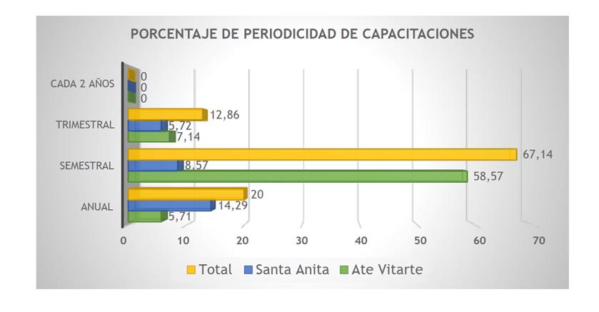 En la Figura 3 se puede apreciar la periodicidad de las capacitaciones del recurso humano, un aspecto clave para la calidad de gestión y atención. Sin embargo, los resultados muestran que solo el 20 % se capacita anualmente; el 67,14 %, semestralmente y el 12,86 %, trimestralmente. Esto representa una gran debilidad de parte de los organismos públicos, ya que lo óptimo es que la capacitación sea el 100 %.