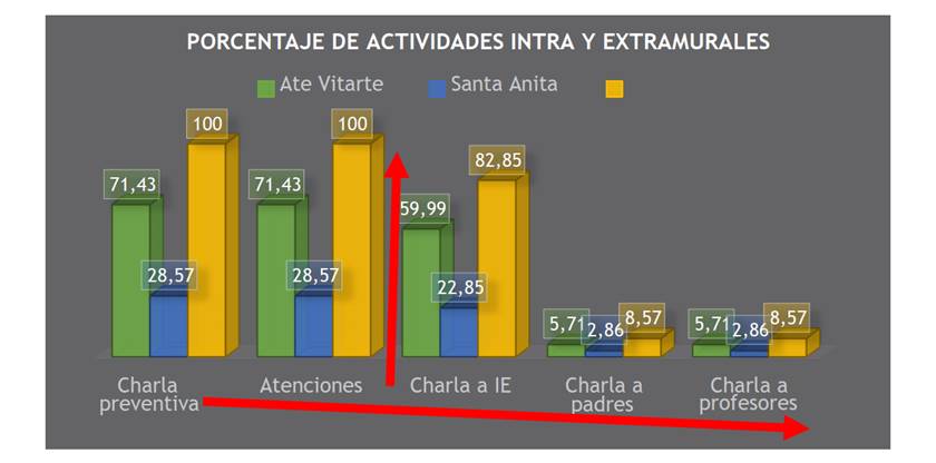 La Figura 4 muestra al profesional odontólogo que dimensiona sus actividades en intra y extramurales. Las actividades intramurales (100 %) incluyen la atención dental, según la demanda, y las charlas preventivas realizadas en las instalaciones del establecimiento de salud. Las actividades extramurales (82,85 %) incluyen las sesiones educativas y demostrativas (técnica del cepillado para estudiantes), además de las charlas a profesores, padres de familia e instituciones educativas.