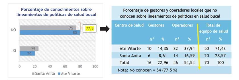 En la Figura 5 se observa que el 77,5 % de profesionales operadores y de gestión desconocen los lineamientos y protocolos en salud bucal. En la Tabla 2 observamos que los gestores (22,96 %) y los operadores locales (54,54 %) desconocen dichas normativas que son trascendentales para su práctica diaria.