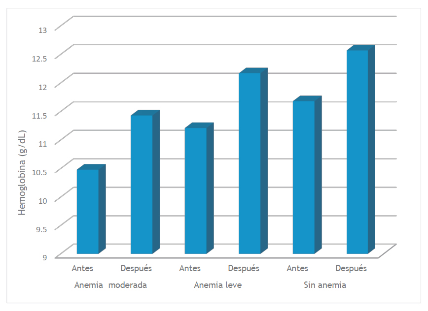 El nivel promedio de hemoglobina de todos los niños al inicio del tratamiento fue de 11,12 ± 0,56 g/dL, y al finalizar, de 12,06 ± 0,66 g/dL. Al inicio del estudio, el 70 % presentaron anemia leve y moderada, mientras que el 30 % restante no tenía anemia. Al finalizar la intervención, todos los niños elevaron su nivel de hemoglobina, con excepción de una niña que no padecía de anemia y cuyo nivel de hemoglobina se mantuvo invariable. El 94,74 % de los niños con anemia leve normalizaron su nivel de hemoglobina; en cambio, considerando exclusivamente a los niños con anemia moderada al concluir el estudio, el 56,25 % de ellos elevó su hemoglobina al nivel normal, el 31,25 % incrementó su nivel de hemoglobina al rango de anemia leve y un 12,50 % elevó su nivel de hemoglobina, pero permaneció en la categoría de anemia moderada. Estos resultados se muestran en la Tabla 1, donde se aprecia los niveles de hemoglobina del grupo de niños sin anemia, aquellos con anemia leve y los niños con anemia moderada.