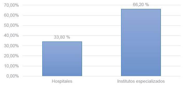 Con respecto al nivel de los establecimientos de salud que prepararon los formatos de CI se obtuvieron los siguientes resultados: los hospitales elaboraron el 33,80 % y los institutos especializados, el 66,20 % (Figura 1).