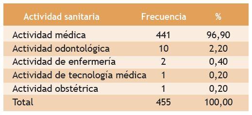 Respecto a la actividad sanitaria, la actividad médica resultó ser predominante, con el 96,90 %, luego la actividad odontológica, con el 2,20 %; la actividad de enfermería resultó ser al 0,40 % y las actividades de tecnología médica y obstetricia, al 0,20 % (Tabla 1).