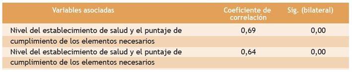 Se utilizó la prueba de correlación de Spearman, lo que permitió confirmar la asociación entre los elementos informativos necesarios (Rho = 0,69; p = 0,00) y deseables (Rho = 0,64; p = 0,00), y el nivel de establecimiento de salud, ambos compatibles a "positiva considerable" (Tabla 2).
