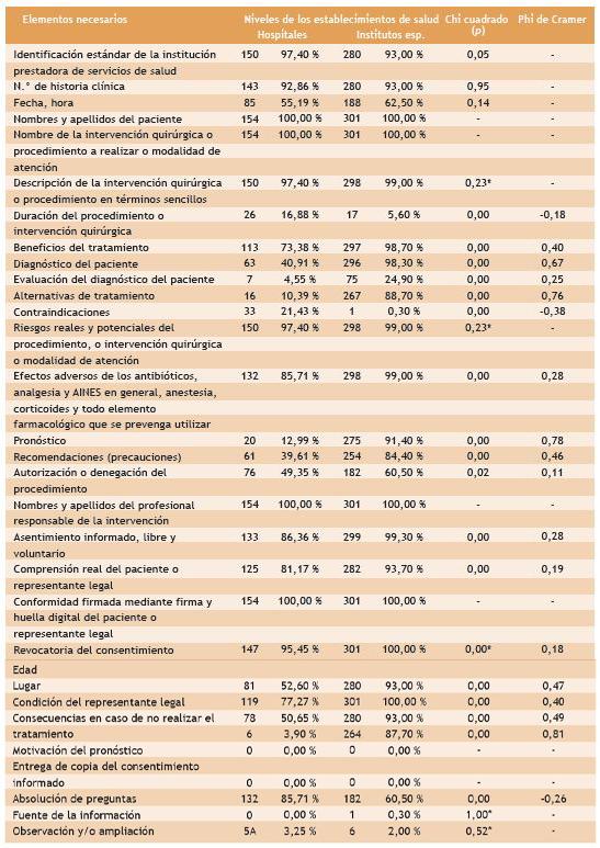 Con respecto a los elementos necesarios, se registró un pleno cumplimiento (100 %) en la afiliación del paciente, profesional de la salud y nombre del procedimiento. Escobar y Novoa obtuvieron resultados similares al registrar los elementos de nombre (94,4 %) e identificación de paciente (91,1 %) 15. Asimismo, Hernández et al. registraron el cumplimiento de datos de filiación del paciente (99,7 %) y del galeno (96,7 %) 18. Cuanto mayor sea el número se advierte que existe una relación significativa positiva (p < 0,05; Φ > 0,00) en los elementos necesarios "Beneficios", "Efectos adversos de los antibióticos, analgesia y AINES en general, anestesia, corticoides y todo elemento farmacológico que se prevenga utilizar", "Pronóstico" y "Recomendaciones". Estos elementos asumen una gran valía al ser información vinculada a eventos indeseados y expectativas derivadas del tratamiento. El reparto de responsabilidades en el acto del CI implica que el profesional de salud asume el deber de informar y actuar diligentemente, y el paciente asume la responsabilidad de los eventos indeseados previamente informados 6. Por el contrario, se registra una relación significativa negativa (p < 0,05; Φ < 0,00) entre el nivel del establecimiento de salud y los elementos de "Duración del procedimiento o intervención quirúrgica" y "Contraindicaciones". Ello se debería a que los elementos mencionados no están codificados en la NTS n.° 139-MINSA/2018/DGAIN, destacando su alcance operativo de la mencionada norma.