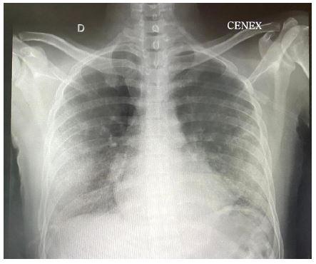 En el examen físico se constata presión arterial de 110/80 mmHg, frecuencia cardíaca de 77x', frecuencia respiratoria de 28x', saturación de oxígeno de 72 %, FIO₂ de 21 %; en el aparato respiratorio se observa amplexación aumentada, uso de musculatura accesoria: tirajes supraclavicular y subcostal, crepitantes difusos de predomino bibasal. El resto de exámenes no brinda ningún aporte al caso.