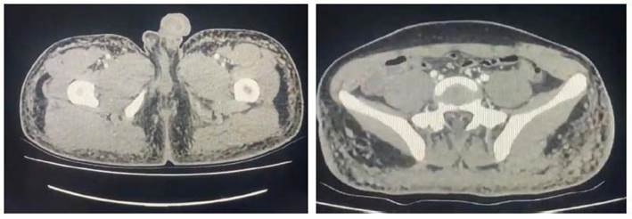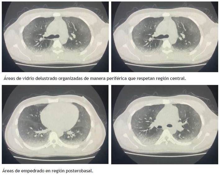 Los exámenes auxiliares proporcionan hemograma con leucocitos: 10 650/mm3, plaquetas: 321 000/mm3, hemoglobina: 6,9 g/dl, volumen corpuscular medio: 87,4 fL, hemoglobina corpuscular media: 29,9 pg. Los exámenes bioquímicos, bilirrubina total: 0,40 mg/dl, bilirrubina directa: 0,10 mg/dl, creatinina: 0,58 mg/dl, urea: 40 mg/dl, deshidrogenasa láctica: 233 UI/L, proteína C reactiva: 2,7, ferritina: 116 mg/dl, dímero D: 1,02 µg/ml, ELISA-VIH I-II: no reactivo, prueba ARN para SARS-CoV-2 en muestra respiratoria por RT-PCR en tiempo real: negativo, prueba rápida antigénica COVID-19: no reactiva, baciloscopia directa para Mycobacterium tuberculosis en orina, heces y esputo: negativos. Radiografía de tórax posteroanterior: patrón alveolointersticial periférico a predominio bibasal; radiografía de tórax (Figura 1), tomografía espiral multicorte con contraste de tórax: áreas de vidrio delustrado periférico respetando área central (Figura 2); tomografía espiral multicorte con contraste de región glútea (Figura 3): nódulos granulomatosos a cuerpo extraño asociados a signos inflamatorios en plano graso subcutáneo de la región glútea y muslos proximales derecho e izquierdo. Recibió oxacilina y clindamicina endovenosas por sospecha de infección de partes blandas en lugar de inyección, anticoagulación terapéutica por sospecha de tromboembolismo, corticoterapia durante 9 días y soporte oxigenatorio. La evolución fue favorable, por lo que fue dado de alta después de 10 días.