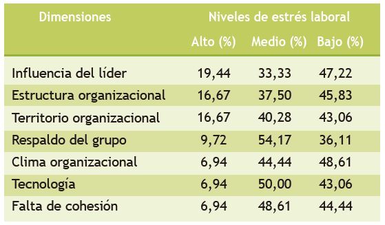 El estrés laboral elevado se observó en mayor porcentaje en las dimensiones influencia del líder (19,4 %), estructura organizacional (16,7 %) y territorio organizacional (16,7 %) (Tabla 1).
