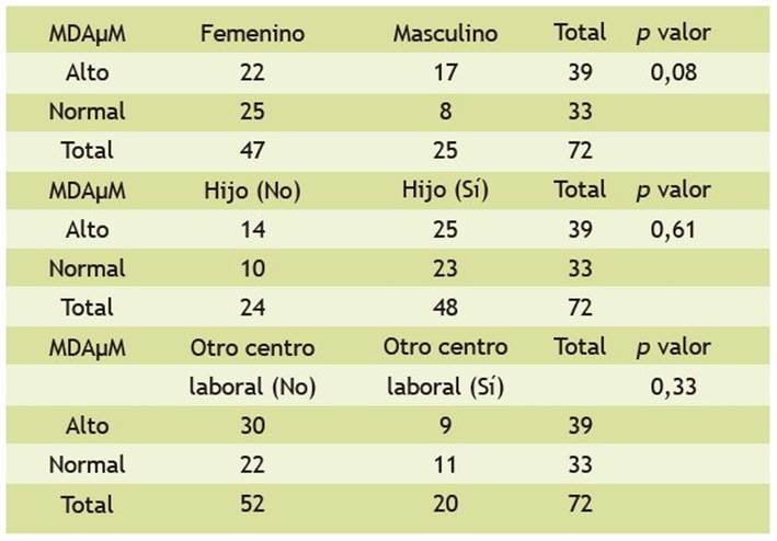 Al evaluar, con Rho de Spearman al 95 % de significancia, la correlación entre los valores de MDA con el sexo, trabajar en otro centro laboral y la atención de hijos en el hogar, resultaron valores de p = 0,08, p = 0,61 y p = 0,33, respectivamente; por lo tanto, no hubo significancia estadística (Tabla 2).