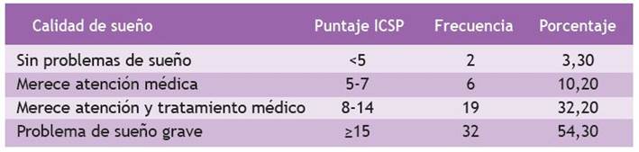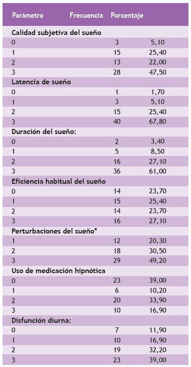 El 27,10 % tuvo eficiencia habitual del sueño menor al 65,00 % y el 49,20 % reportó perturbaciones del sueño. Asimismo, el 50,80 % admitió el uso de medicación hipnótica más de una vez a la semana. El 39,00 % presentó disfunción diurna.