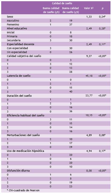 Se encontró asociación entre la calidad de sueño con los componentes de calidad subjetiva del sueño, latencia de sueño, duración del sueño, eficiencia habitual del sueño y disfunción diurna. En los resultados del análisis bivariado hallamos que no existió asociación significativa entre la calidad de sueño y sexo, y tampoco por nivel educativo y especialidad que enseñaba el docente (Tabla 4).