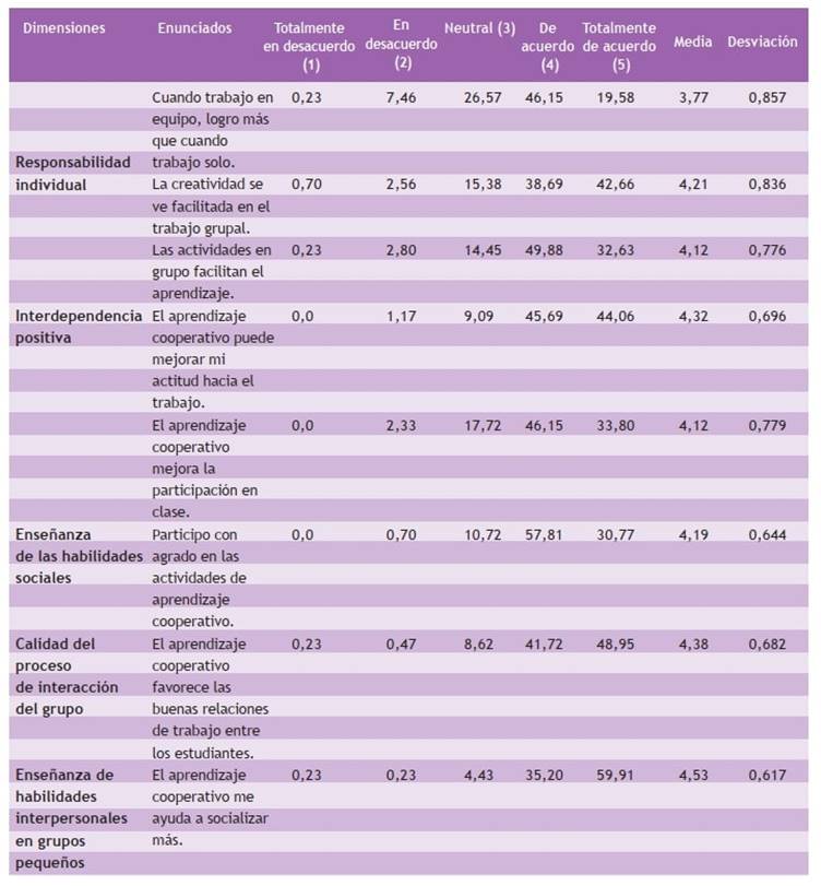 Asimismo, en relación con la dimensión calidad del proceso de interacción del grupo, según la percepción de los estudiantes, el aprendizaje cooperativo favorece las buenas relaciones entre estudiantes. Estos resultados concuerdan con el estudio de Temprado Bernal 26, quien sostiene que el aprendizaje cooperativo favorece un mayor grado de socialización e implica un gran compromiso del maestro. Cabe resaltar que la integración grupal se potencia desde las perspectivas de los estudiantes en la medida en que tienen la oportunidad de interactuar en los entornos virtuales para intercambiar ideas, debatir y llegar a conclusiones sobre los temas planteados.