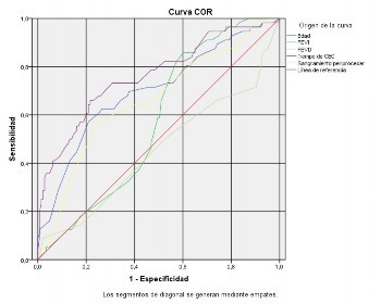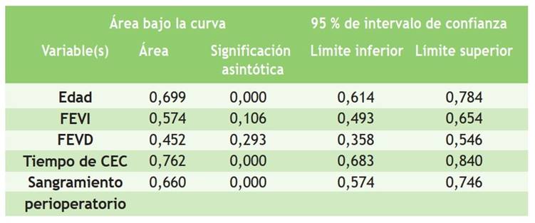Al analizar el área bajo la curva (Tabla 5) y la curva operativa del receptor (Figura 1), a partir de la sensibilidad y especificidad, se comprobó que el área bajo la curva (AUC) tuvo un rango de 0,452-0,762; de ahí la capacidad de las variables para predecir el riesgo de SBGC, donde sobresalieron edad, FEVI, tiempo de circulación extracorpórea y sangramiento.