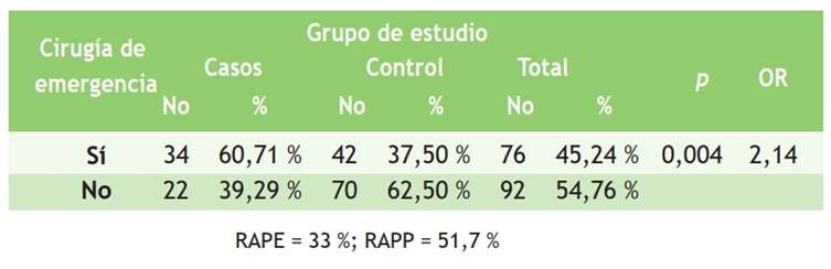 Tabla 2 Relación de pacientes según cirugía de emergencia y grupo de estudio