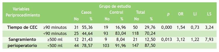 En cuanto a parámetros como el tiempo de circulación extracorpórea, se mostró datos de 50 pacientes (29,76 % [p = 0,000; OR: 1,54; LI: 0,73; LS: 3,24]), los cuales demuestran que este se comporta como factor predisponente en pacientes cuyo tiempo exceda los 90 minutos; en cuanto al sangramiento periprocedimiento, se mostró una minoría de pacientes (12,50 % [p = 0,013; OR: 3,12; LI: 1,22; LS: 7,93]), con una altísima significación estadística y se comportó como un factor de riesgo el sangramiento mayor de 500 ml para la aparición del síndrome de bajo gasto cardiaco (Tabla 3).