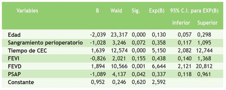Se realizó una regresión logística para determinar cómo las variables clínicas y ecocardiográficas en estudio afectan la probabilidad de presentar SBGC. Se utilizó un total de 112 casos en el análisis. El modelo explicó el 78,9 % de la aparición de SBGC en pacientes operados. Se mostraron valores de p ≤ 0,05 en variables tales como edad, FEVD, CEC, PSAP, lo cual nos permite concluir que tienen una asociación estadísticamente significativa con las complicaciones. No tuvieron significación estadística variables tales como FEVI y sangramiento perioperatorio (p > 0,05) (Tabla 4).