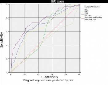 In the series, patients under 65 years of age prevailed in both case and control groups (51.2 % and 73.5 %, respectively). Atrial fibrillation, right ventricular systolic function and perioperative bleeding (p = 0.008) were statistically significant (p < 0.05). Most patients (102 [91.10 %; p = 0.047]) showed a left ventricular ejection fraction (LVEF) > 50 % and a large number of patients (76 [45.24 %; p ≤ 0.05; OR: 2.14]) had undergone emergency surgeries. A logistic regression analysis determined that the clinical and echocardiographic variables, such as age over 65 years, depressed right ventricular function, extracorporeal circulation ≥ 90 minutes and elevated pulmonary artery systolic pressure, had a statistically significant association. The area under the curve (AUC) showed that variables including age, extracorporeal circulation time and perioperative bleeding had predictive capability.