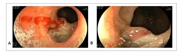 Figura 1 Endoscopia realizada al paciente. (A) Úlcera de esófago con sangrado activo. (B) Úlcera de esófago poshemostasia con adrenalina.