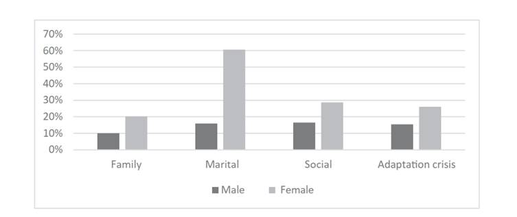 According to the ESTE scale and the measurement of family loneliness, marital loneliness, social loneliness and adaptation crisis, 67 % (n = 143) of the study subjects showed a low level of family loneliness, 79 % (n = 170) a high and medium level of marital loneliness, 51 % (n = 108) a high and medium level of social loneliness, and 43 % (n = 92) a high and medium level of adaptation crisis (existential loneliness) (Table 2). Similarly, a data analysis by dimensions revealed that, in all dimensions, women experience higher levels of loneliness than men (Figure 1).
