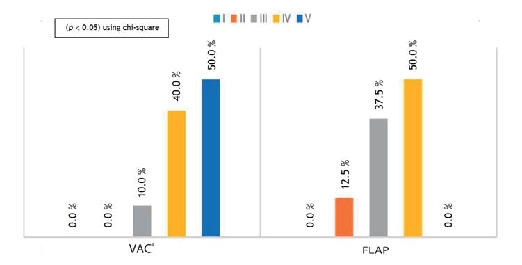 On the other hand, the difference in the postoperative pain intensity between the two techniques was evident, being moderate to severe in patients who underwent the flap technique and mostly mild among those who underwent the VAC® technique. The difference was statistically significant (p < 0.05).