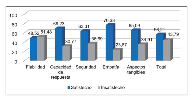 De las 169 personas a las que se les aplicó el cuestionario de SERVQUAL modificado, 95 (56,21 %) se encontraban satisfechas con la atención recibida, mientras que 74 estaban insatisfechas (43,79 %). La dimensión con más satisfacción fue la “empatía”, con 129 personas (76,33 %), y la dimensión con menos satisfacción fue la “fiabilidad”, con 82 personas (48,52 %) (Figura 1).