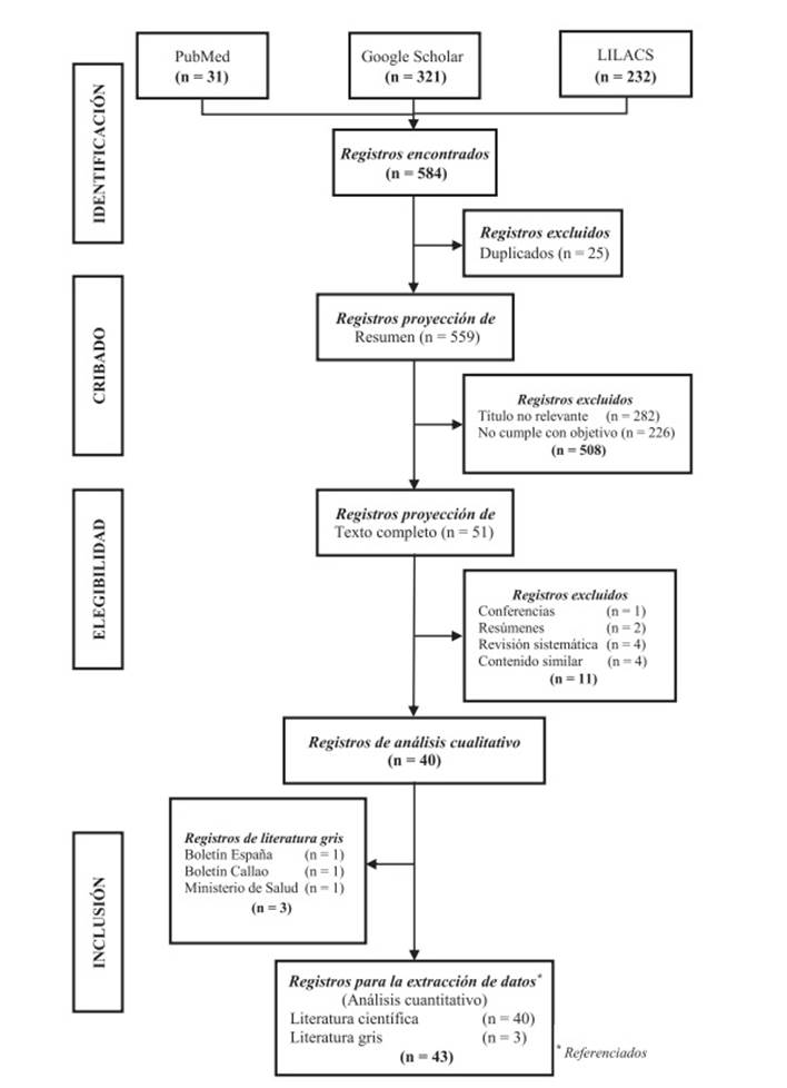 Se realizó una búsqueda bibliográfica, en inglés y español, en PubMed, Google Scholar y LILACS, considerando los operadores lógicos de "EMPB" OR "Coxsackie A16” AND “Childrens" y “Coxsackievirus Infections” AND “Child”. Se identificaron 584 publicaciones (PubMed = 31, Google Scholar = 321 y LILACS = 232) y tres registros de literatura gris (Boletín Español [n = 1], Boletín Peruano [n = 1] y Ministerio de Salud [n = 1]). Se excluyeron los siguientes estudios: 25 por estar duplicados, 508 de los de proyección de resúmenes (282 por no relevancia con el título y 226 por no cumplir con en el objetivo) y 11 de los de proyección a texto completo (uno por ser una conferencia, dos por ser resúmenes, cuatro por ser revisiones sistemáticas y cuatro por tener contenidos similares). Tras el análisis, se eligieron 40 publicaciones, a las que se sumaron tres como literatura gris. Finalmente, se incluyeron 43 estudios para la extracción y análisis cuantitativo de datos publicados entre enero de 2010 y junio de 2022. Durante el proceso se consideraron los criterios de calidad de evidencia y graduación de la fuerza de recomendación a fin de garantizar la calidad de la evaluación y la información sistematizada.