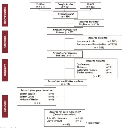 A bibliographic search was conducted in English and Spanish using PubMed, Google Scholar and LILACS, considering the logical operators “EMPB” OR “Coxsackie A16” AND “Children” and “Coxsackievirus Infections” AND “Child.” A total of 584 publications were identified (PubMed = 31, Google Scholar = 321 and LILACS = 232), along with three records from gray literature (Boletín España [n = 1], Boletín España [n = 1] and Ministry of Health [n = 1]). The following studies were excluded: 25 due to duplication, 508 during the projection of abstracts (282 for not being relevant based on the title and 226 for not complying with the objective) and 11 during the projection of full text (one for being a conference paper, two for being abstracts, four for being systematic reviews and four for having similar content). After the analysis, 40 publications were selected, with three additional records from gray literature. Finally, we included 43 studies for the extraction and quantitative analysis of data published between January 2010 and June 2022. Throughout the process, the criteria of quality evidence and the grading of recommendation strength were considered to ensure the quality of the evaluation and the systematized information.