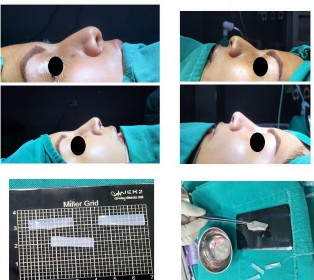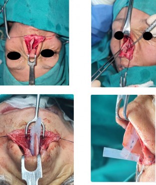 A continuación, se presenta el caso de un paciente de 30 años que fue sometido a una rinoplastia secundaria con injerto de silicona, utilizado como soporte de punta y expansor cartilaginoso. Aquí, los expansores septales fueron cubiertos completamente por la mucosa y el soporte de punta se colocó en el espacio intercrural. En todo momento, se verificó la integridad de la mucosa nasal. Previo al cierre, se revisó que la piel se encontrara lo menos tensionada para proceder a suturar (Figura 3).