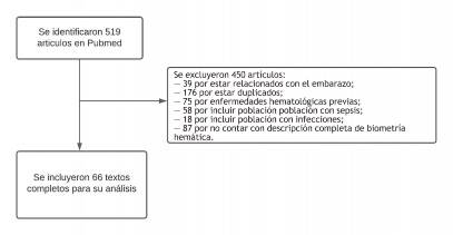 Los criterios de exclusión fueron estudios que incluyeron pacientes con enfermedades autoinmunes con afectación hepática, falla hepática aguda, sepsis, infecciones y alteraciones de la coagulación en enfermedad hepática crónica; y estudios de enfermedad hepática crónica sin reporte de alteraciones hematológicas o con enfermedades hematológicas previas. Todos los resúmenes y textos completos fueron analizados para su elegibilidad por dos de los autores de este estudio. La búsqueda y la selección de los artículos para esta revisión se describen en la Figura 2.