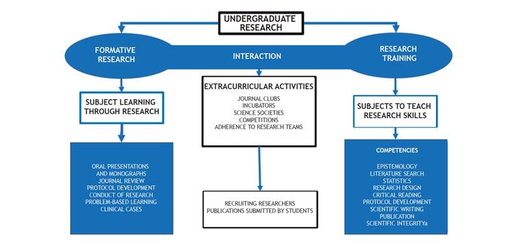 Figure 1 Research teaching at the undergraduate level in a school of health sciences. The figure presents the objective and strategies of formative research, the objective and competencies that students should acquire in research training, and the extracurricular activities that can be developed in the field of research and its objectives.